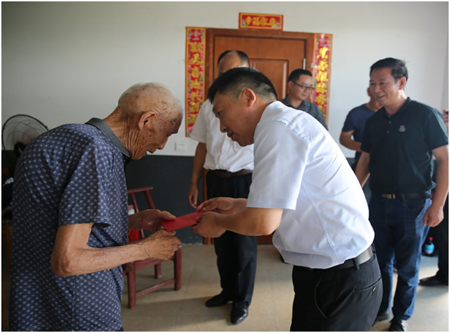 (张格林书记为老功臣周序余送慰问金)