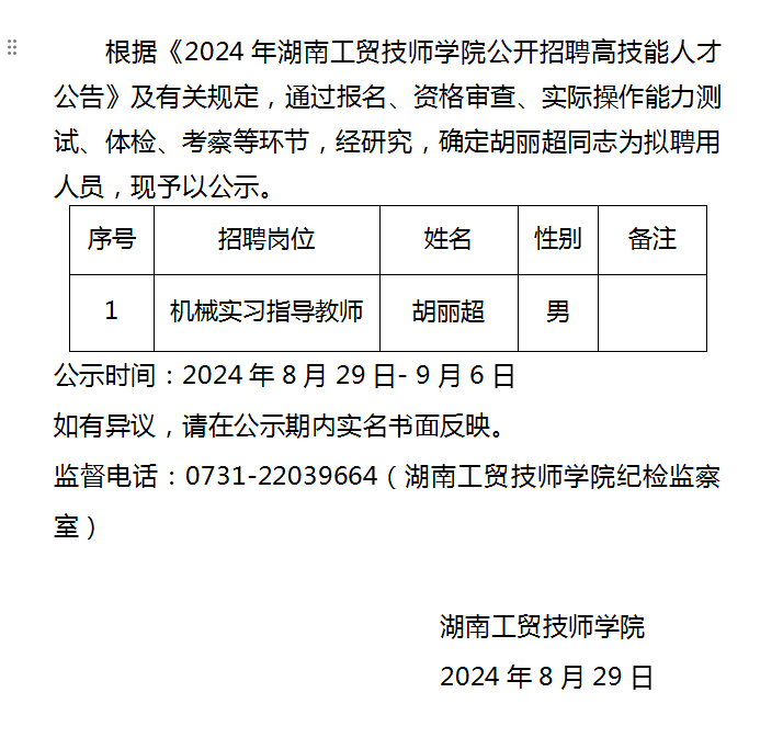 湖南工贸技师开云·体育,开云(中国)2024年公开招聘拟聘用人员公示